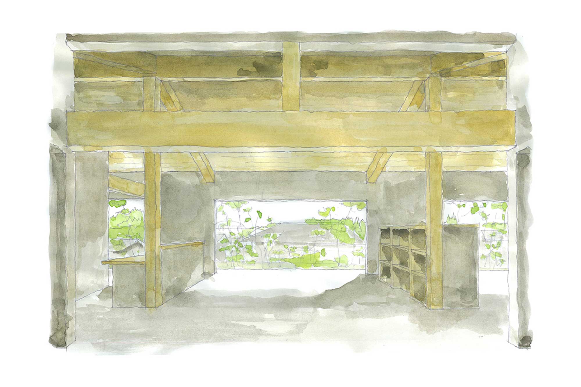 無垢材の大らかな勾配天井と大空間。