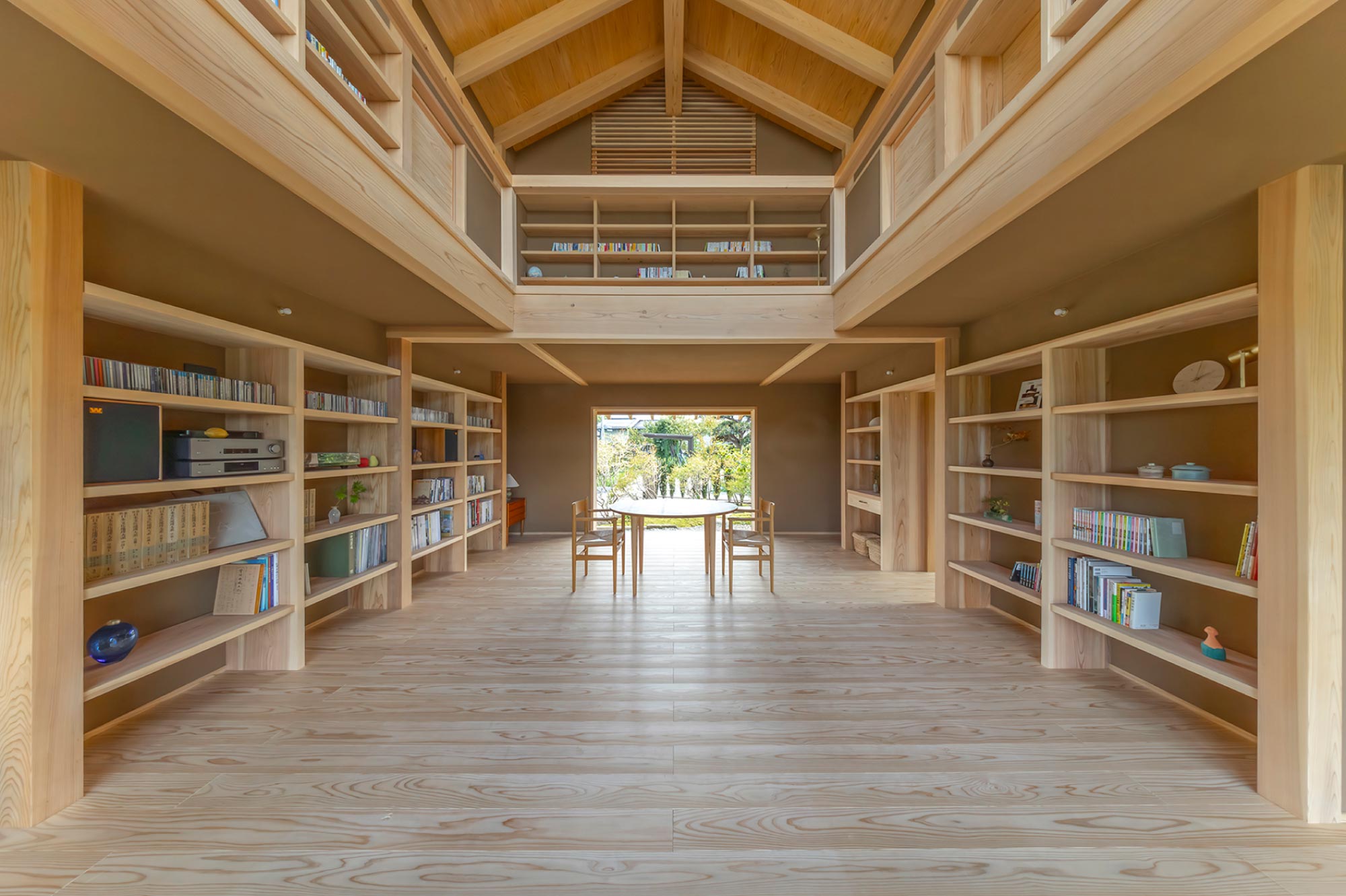 吹抜けで繋がる壁面本棚のある空間で、水面を眺めるひととき。