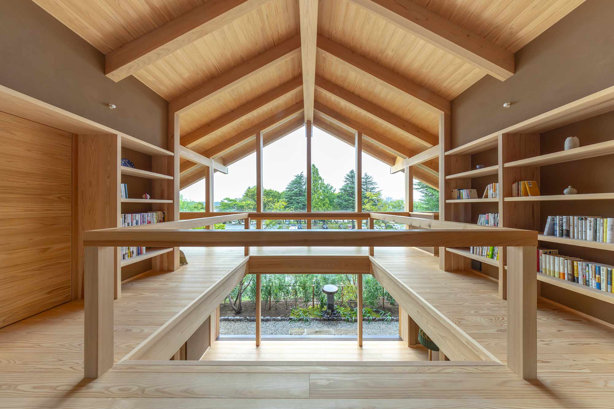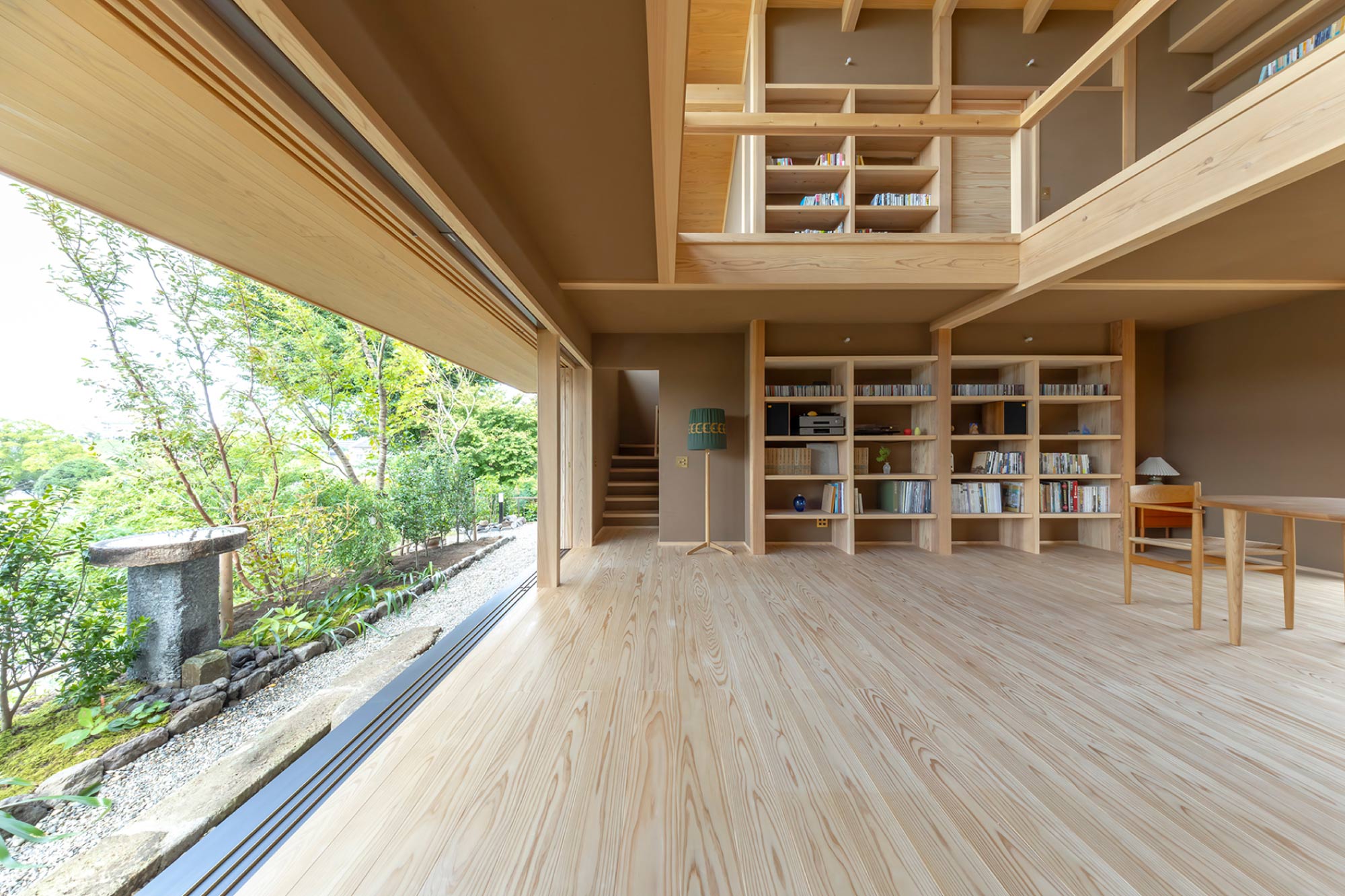 吹抜けで繋がる壁面本棚のある空間で、水面を眺めるひととき。